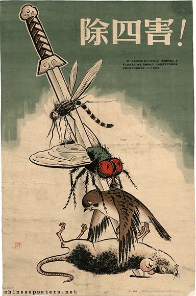 Una de las causas de la hambruna fue la genial idea de cargarse a los gorriones (junto a ratas, moscas y mosquitos) porque Mao les acusó de comerse las cosechas y el grano almacenado. Hoy en día no quedan casi gorriones en China a pesar de ser especie protegida. El daño causado por el aniquilamiento de los gorriones trajo consigo la proliferación de insectos, y entre ellos las langostas.