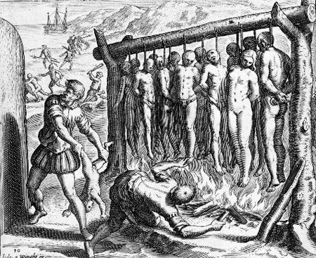Grabado de Theodore de Bry representado las torturas españolas durante su conquista de América.