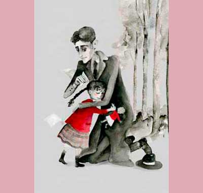 Una mujer se acerca a paso ligero hacia el banco. Mira fijamente al hombre mientras llama a la niña. La coge con fuerza de la mano, y se la lleva a rastras de nuevo al parque mientras le dice ¡Nunca hables con extraños! Pero él sabe dónde está mi muñeca, responde la niña.