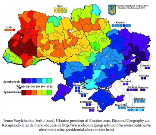 Ucrania, año 2010: el candidato prorruso Víktor Yanukóvich gana las elecciones presidenciales, las pierde la candidata Yulia Timoshenko, pro europea. Dichas elecciones fueron validadas por observadores de la OSCE y del Consejo de Europa. Este fue el mapa de las elecciones: azul pro ruso, rojo pro europeo, un país partido en dos.