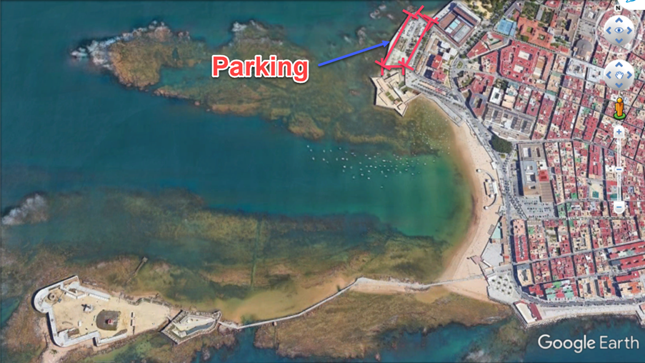 Este se ubica al norte de la Caleta, un extenso terreno frente al mar para que los coches se llenen de polvo y cagadas de gaviota. En verano los atascos en el camino que lleva al parking son kilométricos, y encima bloquean el tránsito, por lo que se convierte en una ratonera para los que no quieren entrar en el parking. En su día era una Academia de Artillería, los terrenos se desafectaron, y lo mejor que se le ocurrió al ayuntamiento es montar un parking cutre, ni siquiera barato.