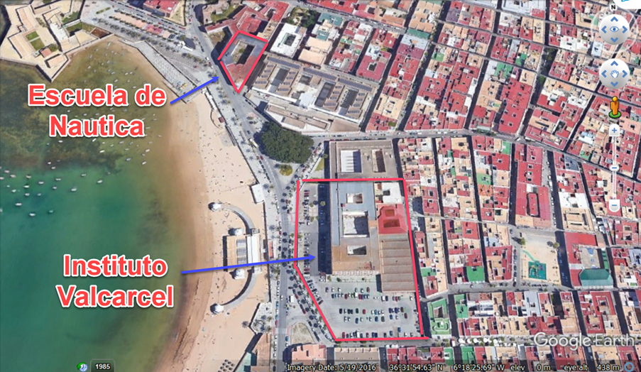 La Escuela de Náutica fue abandonada en el año 2008 cuando se trasladó a Puerto Real. Está tapiada y cuenta con una valla metálica a su alrededor por las piedras que caen. Fue durante unos años hotel de okupas, y hoy es un nido de ratas. Su estado, el de las fotos. Esto a escasos 20 metros del paseo marítimo.