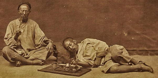 China se forraba entonces a base de vender té, seda, porcelana y obras de arte a occidente. Los países occidentales, entre ellos los EE. UU., Rusia, Holanda y sobre todo el Reino Unido se dedican a inundar China con opio. Este tráfico ilegal de opio por parte de los ingleses provoca una epidemia, afectando al desarrollo de China y su día a día. Todos los chinos colocados. Se estima que la mitad de la población china acabó consumiendo opio. El Emperador manchú de turno prohíbe el tráfico y su consumo, y tras un par de aprensiones y escarceos, se libra la primera guerra del opio (1839-1842) que fue seguida por una segunda entre 1856 y 1860. Resultado: China aplastada.