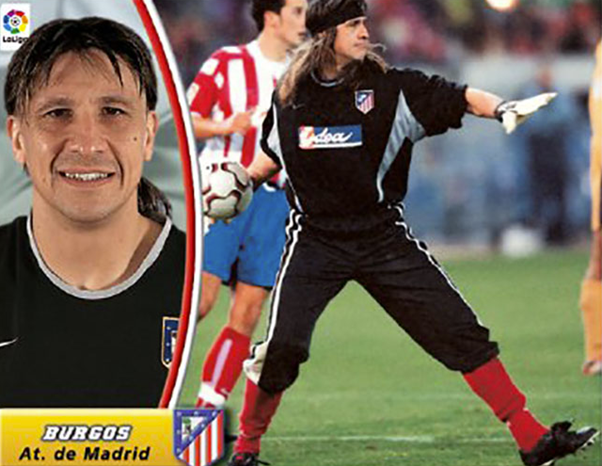 El Mono Burgos fue un portero conocido allá por los años 90 hasta el 2004 cuando se retiró. No dejaba indiferente a nadie: con sus dos metros de altura le pegó un puñetazo a un delantero del Español (11 partidos le cayeron), hacia paradas con la cabeza o el pecho, en los mano a mano se las hacía pasar canutas a los delanteros y como veis, cinta en la cabeza, normalmente gorra, pantalón largo, camiseta remangada, etc. Este argentino no pasaba desapercibido.