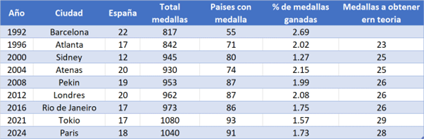 Lo de las 22 medallas como objetivo, igual que en Barcelona 92, es un objetivo tramposo. En Barcelona se repartieron 817 medallas, y en París 1040. Ajá, toca ganar más medallas, 28 y no 22. Más medallas para repartir, más medallas a ganar. Es una simple regla de 3.